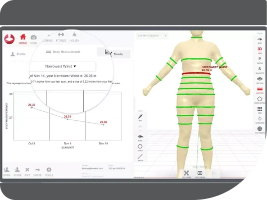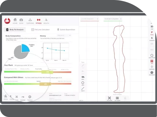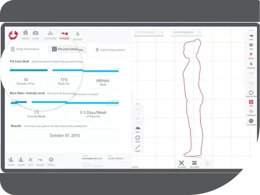 Track baseline circumferences like hip, thing, waist, bust, and more. Use the slider feature to determine how much fat you would like to lose. Set a burn rate/activity level and a target date for your goal. Using basic energy balance, Styku reveals your specific needed caloric deficit to reach your target/goal.